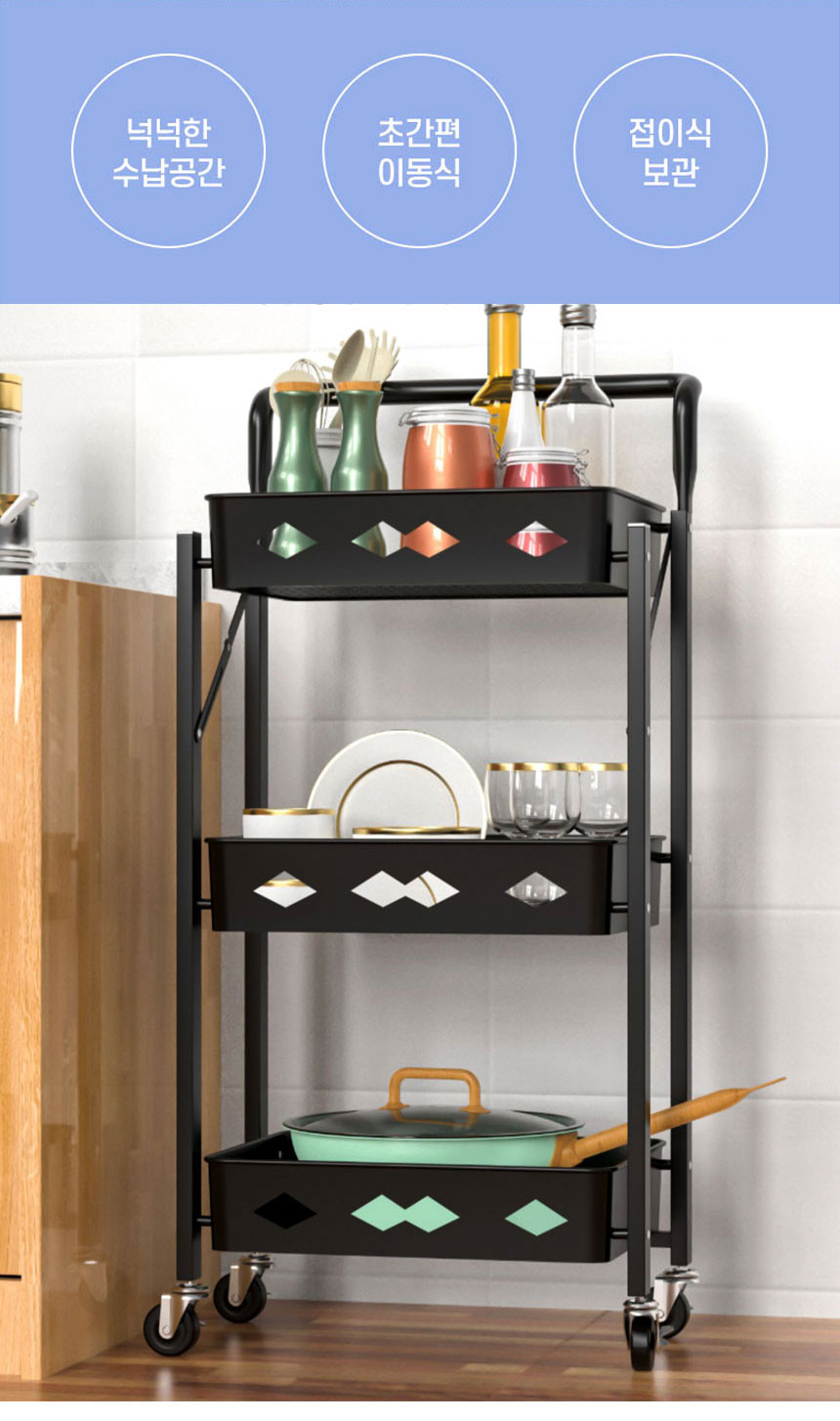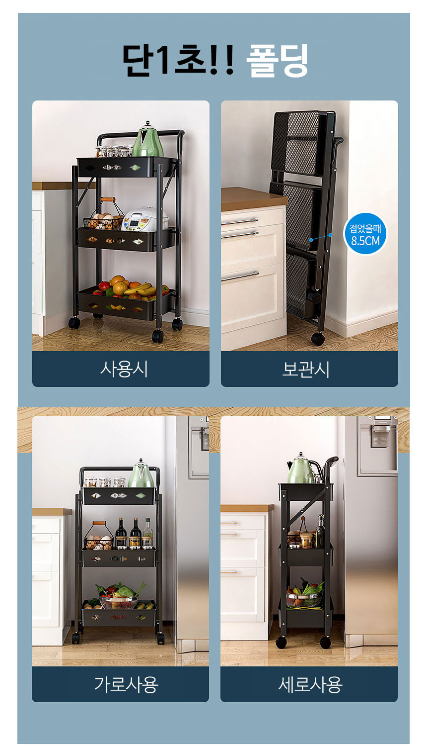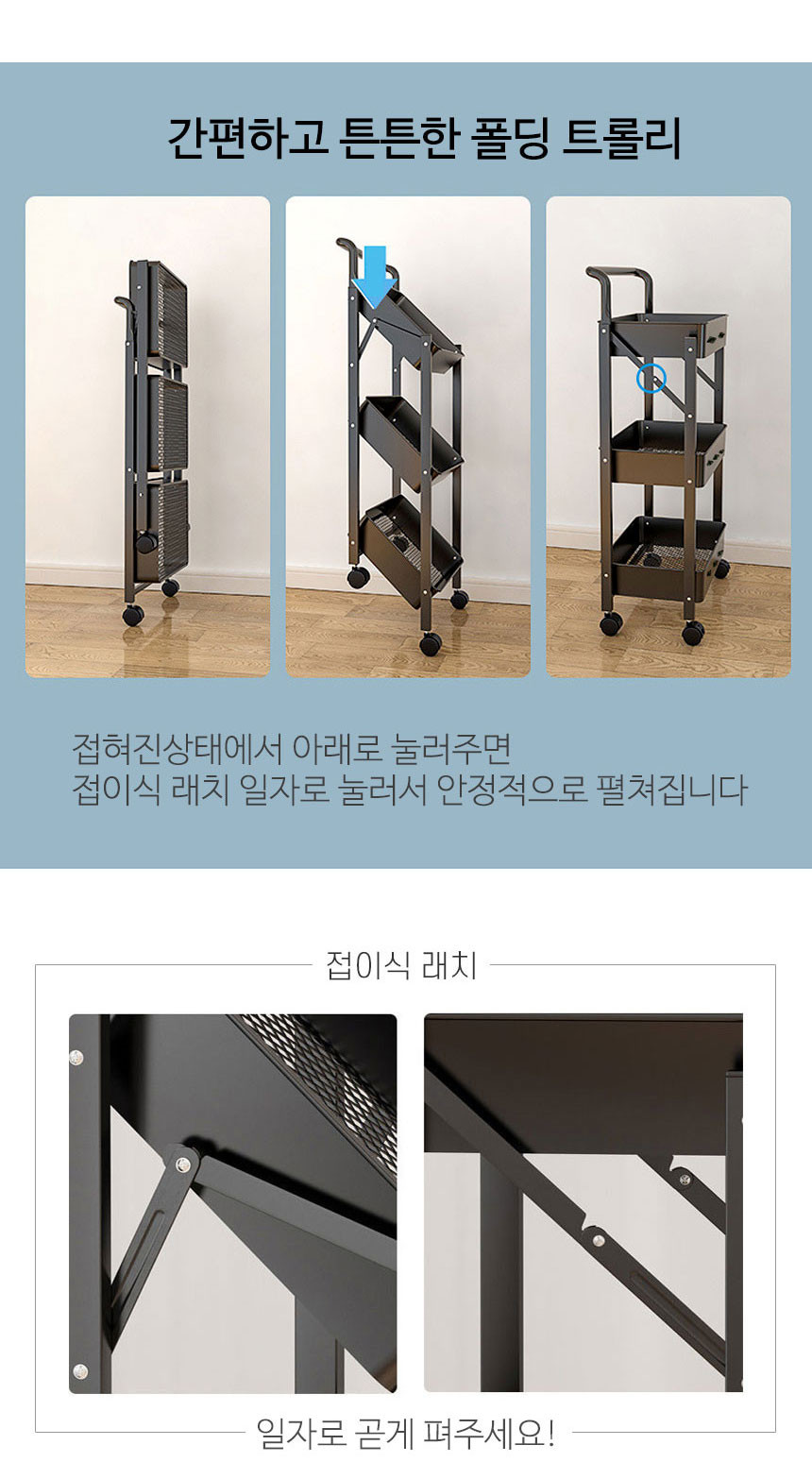 미용실 틈새 세탁실 접이식 트롤리 핸들형 선반 수납선반 거실 바퀴달린 3단 여바라